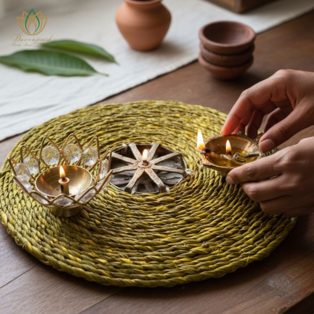 The addition of Dokra metal embellishments—crafted using ancient lost-wax techniques—adds rustic charm and cultural heritage to each mat, turning it into a conversation starter.